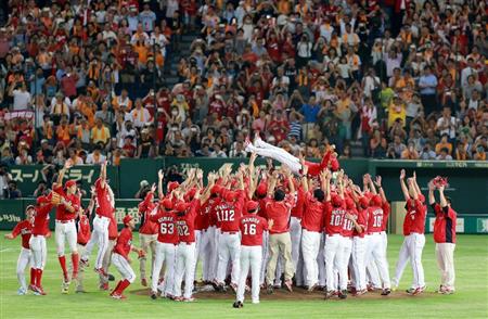 胴上げされる広島・緒方孝市監督=東京ドーム(塩浦孝明撮影)