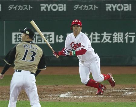 7回、二塁打を放つ広島・田中広輔=22日、マツダスタジアム(撮影・森田達也)