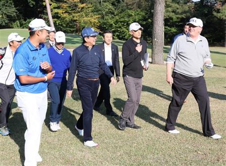 霞ケ関カンツリー倶楽部正門前で、トランプ米大統領が乗る米軍のヘリコプターを撮影する住民ら=5日、埼玉県川越市(黄金崎元撮影)
