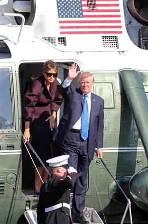 米軍横田基地に到着し、専用ヘリコプター「マリーン・ワン」を降りるトランプ米大統領とメラニア夫人=7日午前、東京・米軍横田基地(桐原正道撮影)