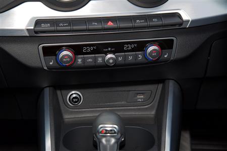 空調ダイヤルのクリック感よし。こういう細かい触感の積み重ねもプレミアム感を醸す。アウディ・Q2