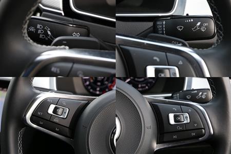 ハンドル周りのレバー、スイッチ類。左上から時計回りにウインカーレバー、ワイパーレバー、インフォテイメント操作ボタン、クルーズコントロール操作ボタン。VW・アルテオン
