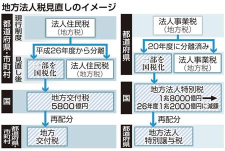 消費税増税に伴い拡大する地方自治体の税収格差を是正する。都道府県や市町村が企業に課す「法人住民税」のうち年約5800億円を国税化して、税収の少ない地方自治体に再配分する仕組みを導入する。法人住民税の税収は平成24年度で約2兆5千億円で、全体の4分の1を充当する。