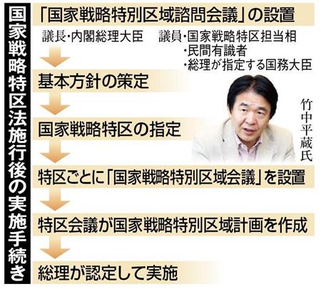 特区推進派の筆頭格だからだが、野党には大企業優先の市場主義者のレッテルを貼られ、小泉純一郎内閣での郵政民営化のしこりから与党内にも煙たがる議員がいるだけに、波紋を呼びそうだ。再び政治の表舞台でスポットライトを浴びる竹中氏は、ヒーロー(英雄)か、それともヒール(悪玉)か。