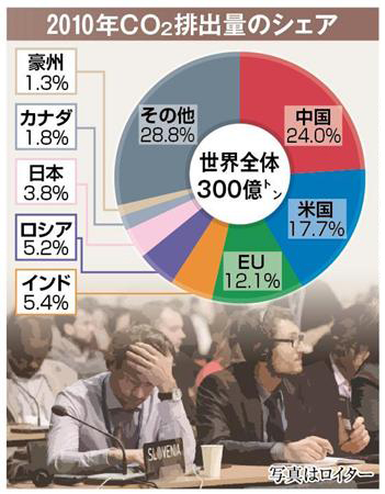 2010年CO2排出量のシェア※各国の比率は、小数点2位を四捨五入しているため合計は100にならない。出典は国際エネルギー機関(IEA)【拡大】