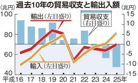 平成25年の貿易収支は過去最大となる11兆4745億円の赤字となった。液化天然ガス(LNG)などエネルギー関連の輸入が膨らんだことに加え、円安の追い風の下でも輸出が伸びていないことが大きな要因だ。自動車や電機など主要製造業で海外への生産移転が進んだほか、国内メーカーの国際競争力が低下したことで貿易立国の基盤が揺らいでいる。