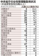 公表は、政府が「女性の活躍」に国家公務員が率先して取り組む姿勢を見せるため、昨年10月時点の22中央省庁の実態を緊急調査した。女性管理職は287人で全体の3・0%。昨年1月の前回調査と比べて0・3ポイントの微増だった。32年までの30%達成には7年間で10倍にする必要がある。