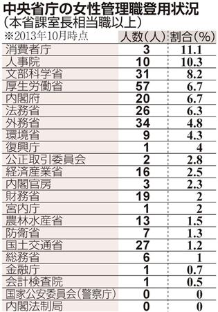 政府は31日、中央省庁の女性管理職の登用状況を公表した。女性管理職の割合は3%で過去最高となったが、あらゆる分野の指導的地位に女性が占める割合を2020年(平成32年)までに30%程度とする政府の目標達成にはほど遠い実態が明らかになった。