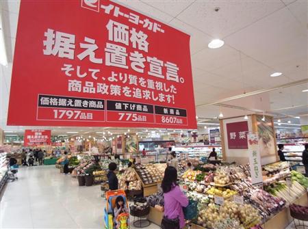 消費税が8%に引き上げられた1日、イトーヨーカ堂は客足をつなぎとめるため「価格据え置き」を宣言した=東京都江東区【拡大】