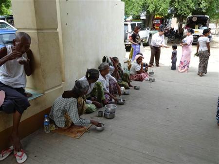 シュエテインドーの仏殿の前にたむろし、物乞いをする人々=ミャンマー・チャウセー郡(筆者撮影)【拡大】