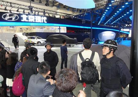 また、韓国の現代自動車は、中国でも人気の韓国ドラマ「星から来たあなた」の主演を務める韓流スター、金秀賢氏を集客に利用。記者会見出席のウワサが流れて来場者が殺到し、会見が午後に延期された。同社ブースにはヘルメットをかぶった警備員が多数動員され、物々しい雰囲気が漂った。