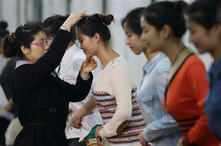 おじぎの練習をする南京の大学生。職業教育と大学の単位の互換制度を呼び掛ける声も上がっている(中国新聞社)【拡大】