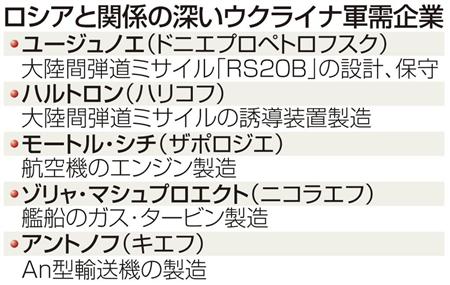 ロシアが米国と張り合う戦略兵器では、主力大陸間弾道ミサイル(ICBM)の「RS20B」を設計したのが、ウクライナ東部ドニエプロペトロフスクのユージュノエ社だ。同社が保守や修理を担ってきたため、ロシアは現状が続いた場合には自力で補修するなど対応を迫られる。このミサイルの誘導装置も、ウクライナ東部ハリコフの企業が製造している。