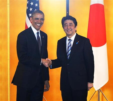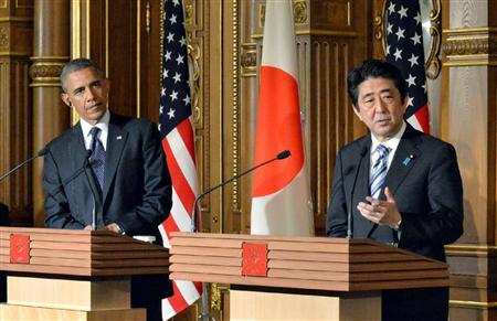 安倍晋三首相とオバマ米大統領は24日午前、東京・元赤坂の迎賓館で首脳会談を行った。両首脳は、日米同盟がアジア太平洋地域で主導的な役割を果たすことで一致し、オバマ氏は尖閣諸島(沖縄県石垣市)が日米安全保障条約の適用対象であることを明言した。焦点の環太平洋戦略的経済連携協定(TPP)交渉は、日米間の閣僚協議継続で一致したが合意には至らず、共同声明の発表はいったん見送られた。首脳会談は、午前10時半ごろから約1時間45分行われた。