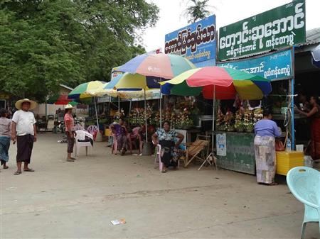 パヤー(寺院)の周辺に並ぶカドーブェ店。恰幅のよい麦わら帽子の男性やカメラの方を向いている女性は店主たちで、マ・トゥー・ス・チェーのメンバーである(高橋昭雄氏撮影)【拡大】