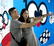 中国本土で最大規模のドラえもん展が27日、青島で始まった。高さ1.2メートルの100体のドラえもんがいろいろな「ひみつ道具」をもって展示されており、観衆は記念写真を撮っていた。(中国新聞社)