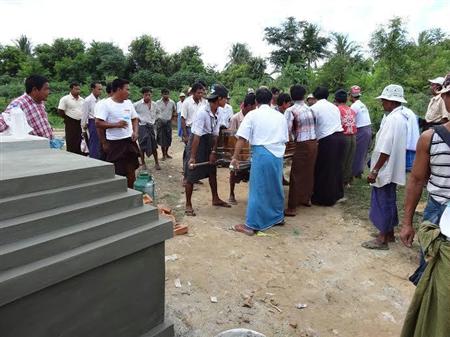 ウー・タンマウンの葬儀は2013年8月15日に行われた。遺体はそのまま、レンガとモルタルで作られたグーと呼ばれる墓(手前左)に棺ごと納められた(筆者撮影)【拡大】