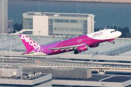 福岡空港に向け離陸するピーチ機=関西国際空港【拡大】