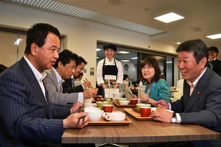 食堂を訪れたのは甘利氏、茂木敏充経産相、田村憲久厚生労働相、稲田朋美行政改革担当相。今月12日にオープンした同食堂に甘利氏が関心を持ち、それを聞いた茂木氏が各閣僚を招いたという。この日は、茂木氏がポケットマネーで3閣僚に定食をごちそうし、稲田氏は「とてもおいしかった」と笑顔を見せた。