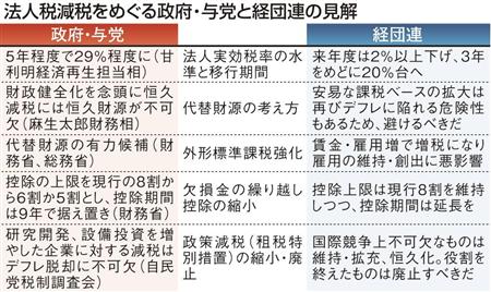 外形課税強化と並び政府が代替財源の最右翼と見る「欠損金の繰り越し控除制度」の縮小についても、経団連は難色を示す。政府は現在、過去の決算の赤字を大企業なら翌年度以降の黒字から8割を差し引ける仕組みについて、上限を6割か5割に下げ、控除期間は現行の9年のまま据え置く案を検討。その場合、現在より赤字企業の税負担が重くなる。このため、経団連は、控除の上限を維持しながら、控除期間を延長することで、期間全体では増税にならないよう求めた。
