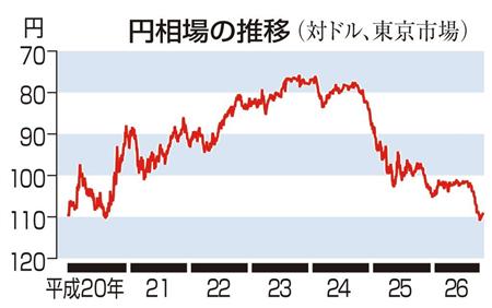 外国為替市場で円安ドル高の動きが強まっている。1日に一時1ドル=110円台まで下落した円は、その後やや買い戻されたが、3日のニューヨーク外為市場では、米雇用統計の改善を受けて大幅反落し109円台後半と再び大台突破をうかがう動きとなった。これまで円安は日本経済にプラスとの見方が支配的だったが、輸入物価の上昇などマイナス面も指摘されはじめており、専門家の間でも見解は分かれている。(塩原永久、藤原章裕)