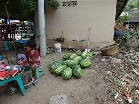 中国からのF1ハイブリッド種子で作られた西瓜。ラグビーボールのような形で、日本の西瓜よりかなり大きい=ミャンマー・チャウセー郡(筆者撮影)【拡大】