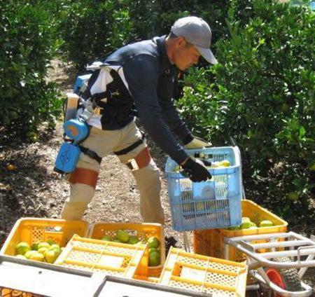 和歌山大学のロボティクス研究室が開発した農業用のアシストスーツ。約20キロのミカンのケースを半分の力で運搬できる(同大提供)【拡大】