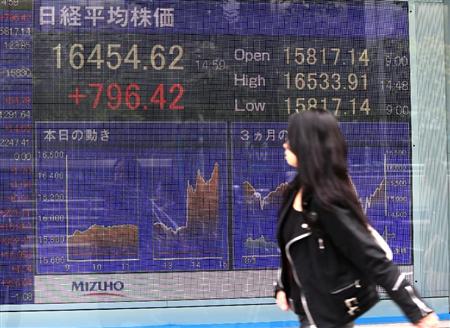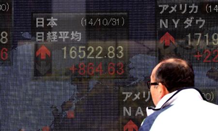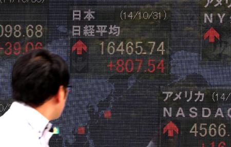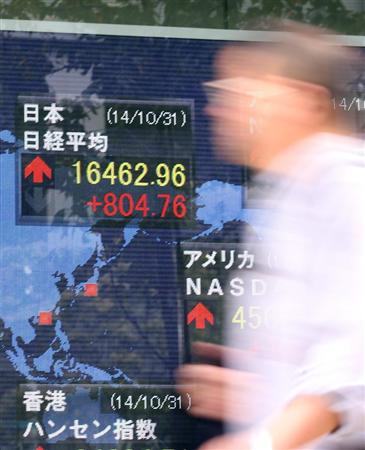 31日の東京株式市場は日銀の追加金融緩和の発表を受けてほぼ全面高となり、午後に暴騰した。日経平均株価の終値は、前日比755円56銭高の1万6413円76銭。終値としては、2007年11月2日以来、ほぼ7年ぶりの高値水準となった。