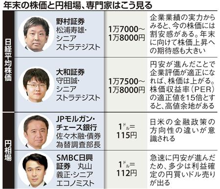 加えて、日銀の追加緩和で、量的金融緩和を終了し利上げも視野に入る米国との金利差が拡大するとの思惑から、円安に拍車がかかっていることも株価の大きな下支えとなっている。平成26年9月中間連結決算を発表した企業の多くは、下期の見通しを1ドル=100~105円台としている。