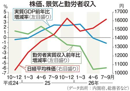 まずグラフを見てほしい。平成24年10~12月期以降の日経平均株価と実質国内総生産(GDP)の伸び率、勤労者実質収入の伸び率の推移を追っている。実質とは、名目値から物価の上昇率を差し引いた正味の分だ。