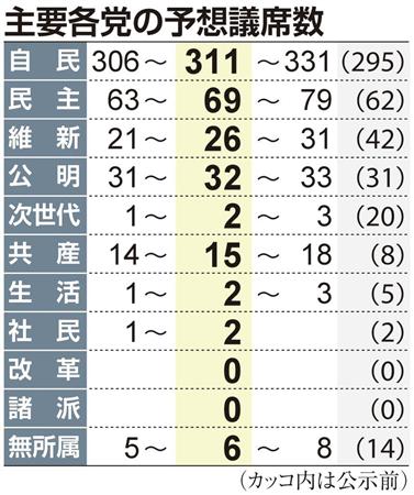産経新聞社は8日、FNN(フジニュースネットワーク)と合同で実施した電話世論調査(4~7日)に全国総支局の取材を加味し、14日投開票の衆院選終盤情勢をまとめた。自民党は、平成21年に民主党が単独政党として獲得した現行憲法下での最高議席(308議席)を上回り、衆院の3分2に当たる317議席をうかがう勢い。民主党は目標の100議席は難しい情勢だ。共産党は前回(8議席)の倍増をうかがう勢いだが、その他の野党は軒並み苦戦を強いられている。