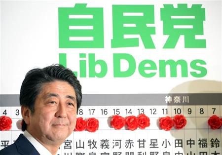 自民党本部の開票速報場で自身の当確のバラをつける安倍晋三首相=14日午後、東京・永田町の自民党本部(早坂洋祐撮影)【拡大】