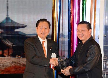 日本を訪れた外国人客が22日、年間1300万人を達成し成田空港で記念式典が開かれた。インドネシアから来日したIT関連経営者のインドラジャティ・エディさん(48)に太田昭宏国土交通相が記念品を贈った。