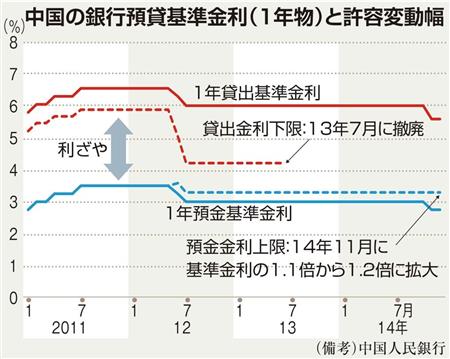 景気減速が続く中、2014年11月に中国人民銀行(中央銀行)は12年7月以来の利下げを行った(1年貸出基準金利6.0%→5.6%、同預金基準金利3.00%→2.75%)。同時に、金融自由化に向けた動きとして、預金金利の許容変動幅の上限を引き上げた(基準金利の1.1倍→1.2倍)。