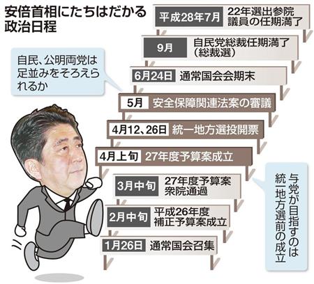 平成27年度予算案が14日、閣議決定されたが、今年度内成立は困難な情勢にある。政府・与党は、統一地方選前半戦の投票日となる4月12日までの成立を目指す。予算審議が遅れると、統一選のみならず、後半国会の目玉となる集団的自衛権の行使容認を含む安全保障関連法案の審議にも影響が出かねない。「1強多弱」とはいえ、先の臨時国会では閣僚のスキャンダル追及で審議が滞った経験もあり、政府・与党にとって綱渡りの国会運営になるのは間違いない。