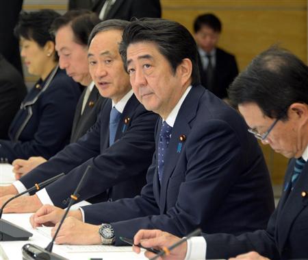 月例経済報告関係閣僚会議に臨む(右から)麻生太郎副総理・財務金融相、安倍晋三首相、菅義偉官房長官ら=23日午後、首相官邸(酒巻俊介撮影)【拡大】