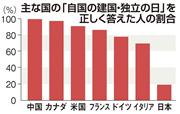同様に日本国内の街頭ヒアリングと、委託した調査会社があらかじめ登録されている日本国内在住の外国人の中から無作為抽出した各国の18歳以上の男女計300人にメールで尋ねたところ、「自国の建国・独立の日」を正しく答えた割合は中国が100%でトップ。カナダ97・7%、米国91・3%などと続いた。母数が異なるため単純な比較はできないが、日本は極めて低かった。