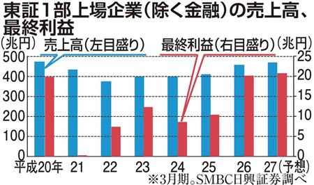 東証1部に上場する企業(1267社、金融除く)の平成27年3月期の最終利益の合計額が、過去最高を更新する見通しとなったことが13日、SMBC日興証券の集計で分かった。円安を追い風に、収益の海外比率が大きい自動車や電機などの業績改善が目立つ。今後、好業績を継続するためには国内景気の回復がカギとなりそうだ。(藤原章裕、大島直之)