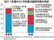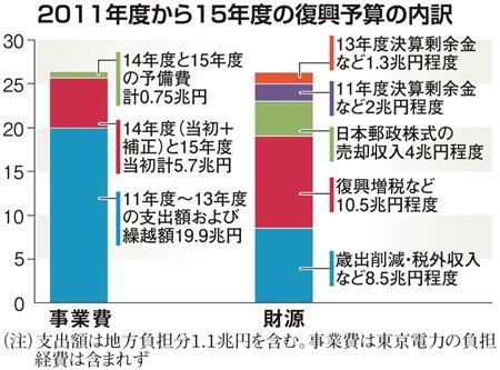 11年度から15年度の集中復興期間の総事業費は26兆3000億円に達する見込み。この財源をまかなうのは復興増税で、所得税は13年度から37年度まで税率を2.1%引き上げて7兆3000億円を確保する。個人住民税は14年度から10年間、1人当たり年間1000円多く徴収する。さらに、政府は今秋にも上場する日本郵政株式の売却益を4兆円見込む。15年度までの復興財源は国の収入を先食いする「異例の対応」(麻生太郎財務相)でしのいでいる状況だ。