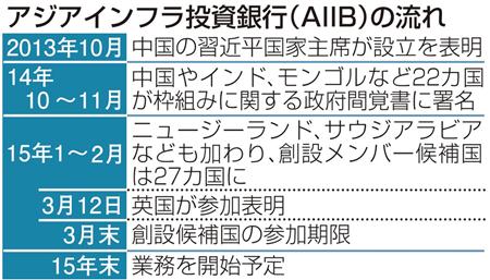 政府は16日、中国が主導する国際金融機関「アジアインフラ投資銀行(AIIB)」への現段階での参加は見送る方針を固めた。借入国の返済能力を超える巨額の融資が行われ、別の国際機関に損害を与える可能性が指摘されていることが主な理由だ。中国が創設メンバーへの参加期限とする3月末が迫る中、日本政府の立場となる対処方針案にこうした考えを盛り込む。