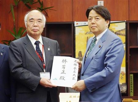 TPP交渉における国会決議を実現するよう林芳正農林水産相(右)に要請するJA全中の万歳章会長=20日、東京都千代田区の農林水産省【拡大】
