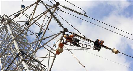 送電線の器具を交換する作業員。4月に発足する電力広域機関は送電網の増強などを推進する=三重県桑名市【拡大】