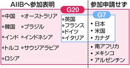 中国主導のアジアインフラ投資銀行(AIIB)をめぐる問題で、16日から開かれる20カ国・地域(G20)財務相・中央銀行総裁会議は、中国が創設メンバーの参加申請の期限とした3月以降に開かれる最初の国際会議となる。日本もG20各国との対話を通じ、今後の対応を見極める重要な機会となりそうだ。