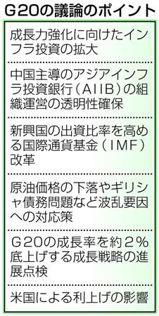 しかし、ギリシャの財政問題をめぐる混乱が引き続き欧州経済に波紋を呼ぶ可能性があるほか、原油価格の動向や為替のドル高基調、6月以降に見込まれる米国の利上げ開始がもたらす影響といった不確定要素も少なくない。G20として、市場の急激な変動を回避し経済を下支えする具体的なメッセージも期待されている。