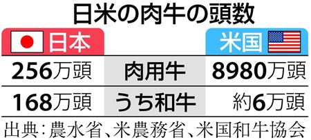 米国産和牛は日本から米国に持ち込まれた和牛の血統を引く肉牛。米国和牛協会によると、米国産和牛の推定頭数は和牛同士をかけあわせた「フルブラッド」で5千~1万頭、和牛と別の品種による「ハーフブラッド」で5万頭程度。2014年には前年比40%増の2600頭が新たに登録された。