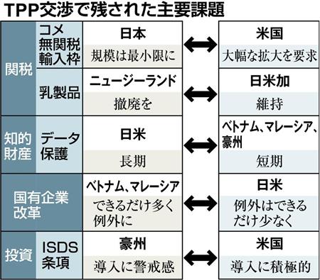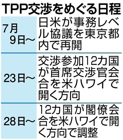 12カ国は、23日からの首席交渉官会合で残された課題を絞り込み、閣僚会合で政治判断による決着を図りたい考えだ。閣僚会合の期間は29日までの2日間とする案が浮上しているが、「交渉が長引いて8月上旬にずれ込む可能性もある」(交渉筋)という。