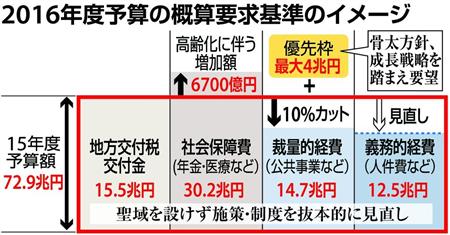 政府が与党に提示した2016年度予算の概算要求基準案は、民間需要の喚起やイノベーションを誘発する効果が見込める施策に優先配分する特別枠を約4兆円設けた。公共事業などの裁量的経費を1割削減し、成長志向の予算に重点化させる狙いがある。ただ、景気腰折れを懸念して予算総額は決めず、歳出抑制への道筋は見えないままだ。