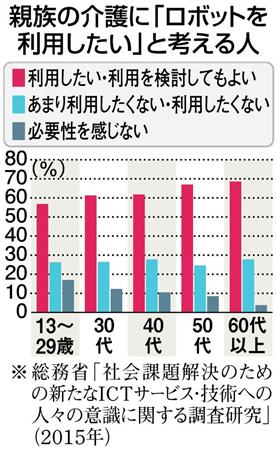 会話など人間とのコミュニケーションが可能なロボットの活用をめぐり、「介護目的で利用したい」と考える人が全年齢層で過半数に達し、高齢になるほど利用意向が強まることが、総務省が28日発表した2015年版「情報通信白書」で明らかになった。一方で「子育て支援に利用したい」と考える人は3割前後と低く、普及が本格化してきたロボットへの期待の濃淡が浮き彫りになった。