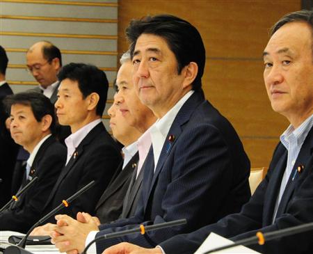 月例経済報告等に関する関係閣僚会議に臨む安倍晋三首相(右から2人目)=26日午後、首相官邸(斎藤良雄撮影)