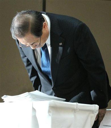 2015年3月期連結決算会見の冒頭、頭を下げる東芝の室町正志社長【拡大】
